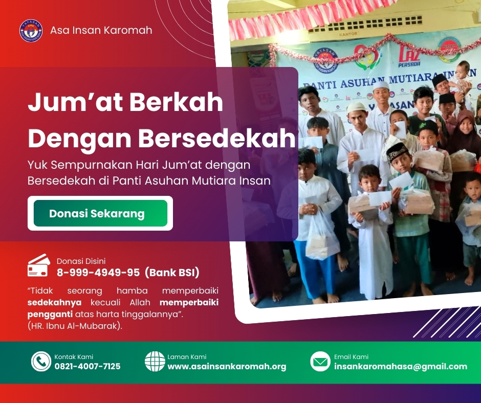 Penutupan: Mari kita jadikan setiap Jum’at sebagai momen berkah dengan berbagi kasih kepada mereka yang membutuhkan. Dukungan Anda akan memberikan harapan dan kebahagiaan bagi anak-anak di Yayasan Panti Asuhan Mutiara Insan. Terima kasih atas perhatian dan partisipasi Anda.